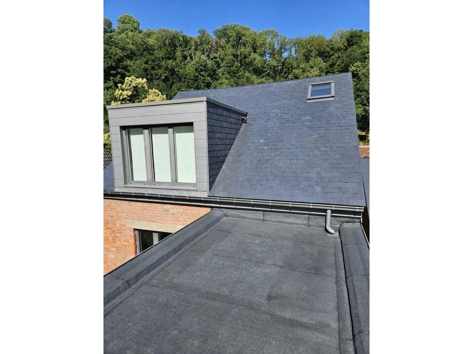 À quelques pas de la Citadelle de Namur, notre équipe a réalisé le remplacement de la toiture inclinée en ardoises naturelles, ainsi que l’isolation et l’étanchéité des deux toitures plates à l’arrière de la maison. Ils ont également réalisé l’étanchéité et l’habillage des trois lucarnes.